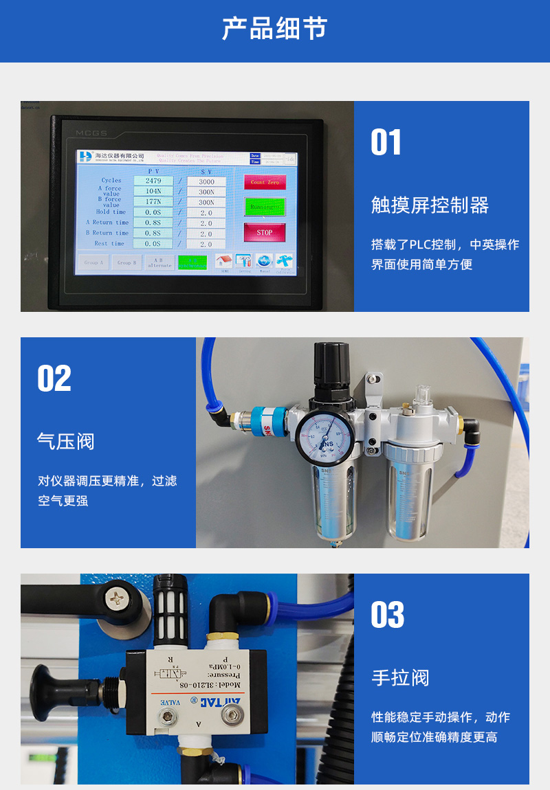 1、2組氣動致動器可做10度活動式傾斜安(ān)裝或垂直(zhí)固定式安裝. 另外2組水平(píng)安裝致動器(qì)可作椅腳水平推力測試,此兩組水平安裝製動(dòng)器調節範圍(wéi)20mm~250mm, 推力(lì)為(wéi)0-60kg. 左右兩邊的製(zhì)動器可單獨工(gōng)作或同時工作。 2、扶手高度調節範圍:550mm ~950mm 3、推力可調,持壓時間可(kě)調 4、試樣尺寸寬度:0-1000mm 5、測(cè)試速(sù)率:10~30次/min 6、致動器(qì)前端設計可輕鬆裝卸不同的加載塊 7、帶力值、峰值顯示 8、垂直致動器(qì)出力:0-100kg 9、水平推力:0-70 kg 10、配件: 38 mm 高擋塊 x 2 件 扶手加載塊 1 對 11、動(dòng)作模式:可單獨(dú)控製左邊、右邊製動器工作或同(tóng)時(shí)工作 | ||