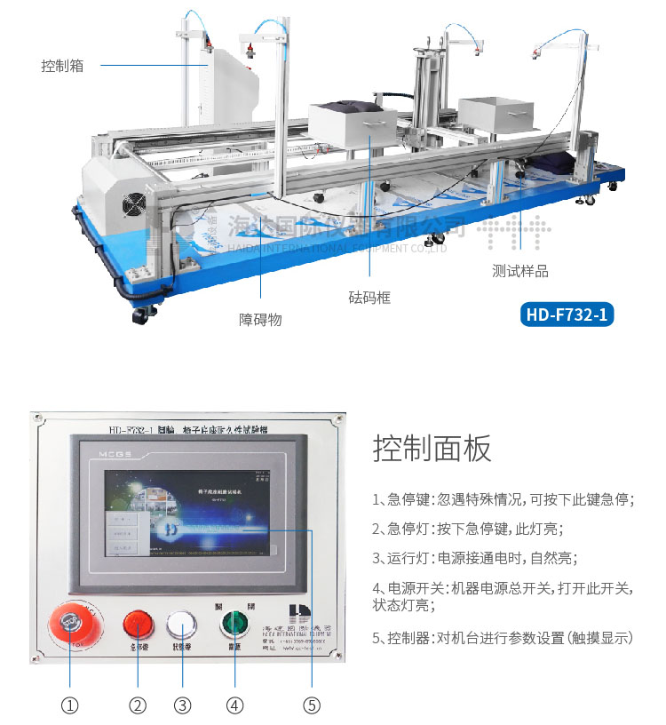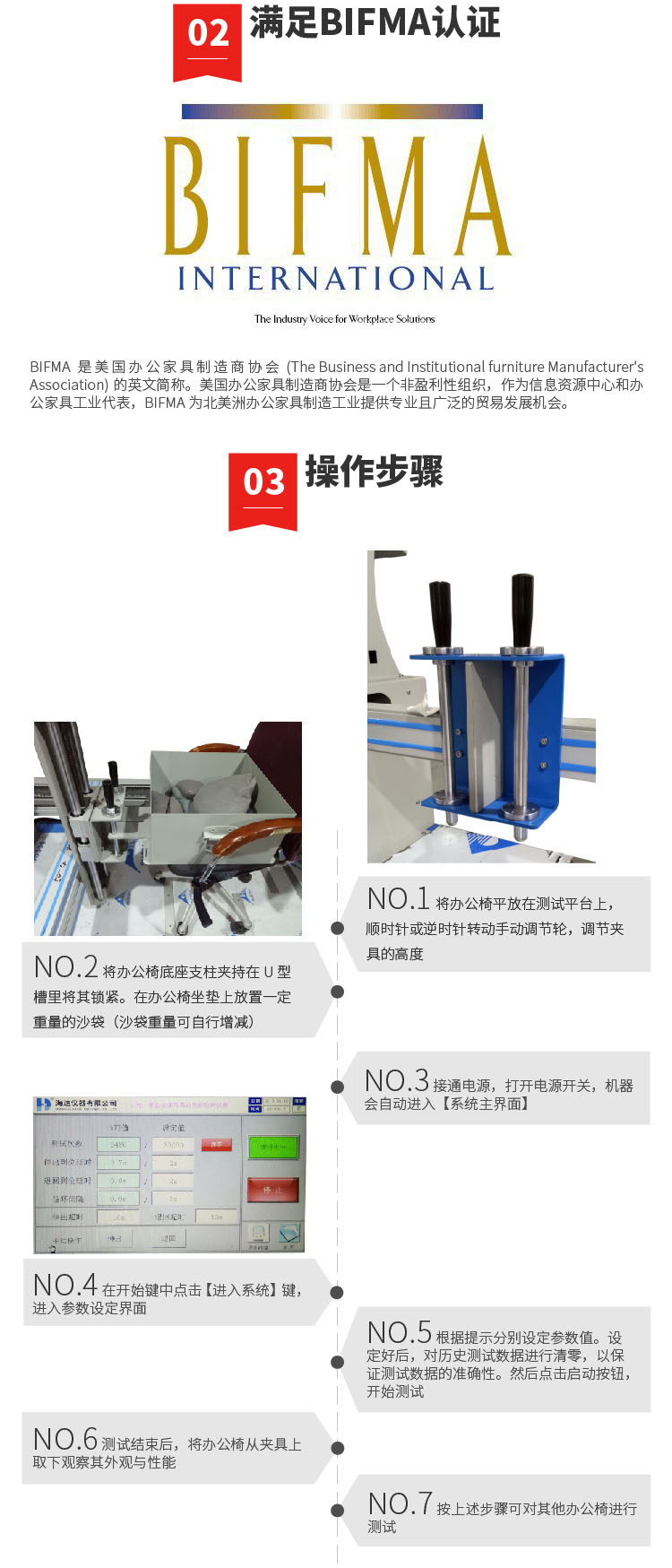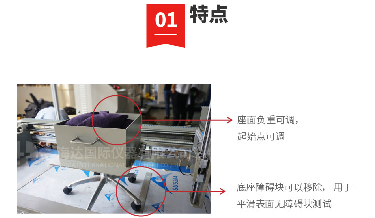 本(běn)機(jī)適用於所有帶腳輪或椅輪的辦公椅,評核腳輪及椅框對於抵受椅子前後移動所引起的疲勞壓(yā)力及磨損能力。