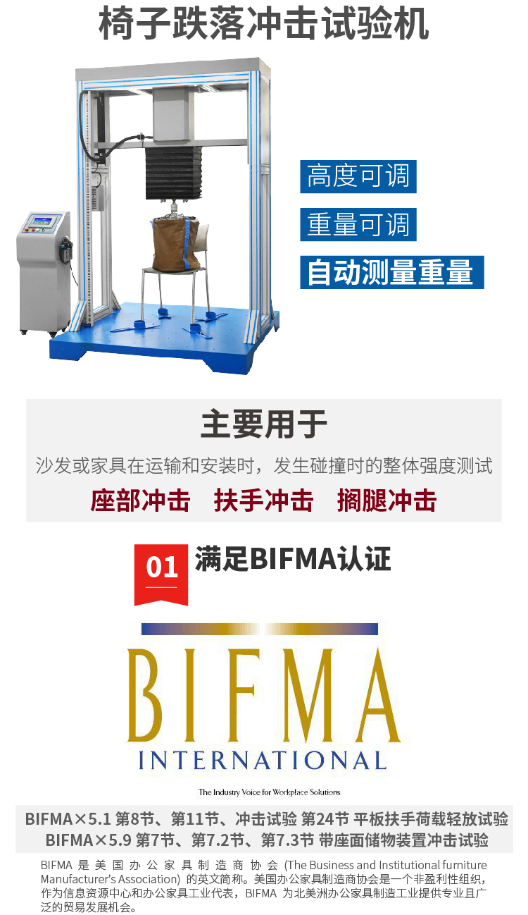 設計標準(zhǔn):Bifma×5.1 第(dì)8節、第11節、衝擊試(shì)驗 第24節 平板扶手荷載輕放試驗
