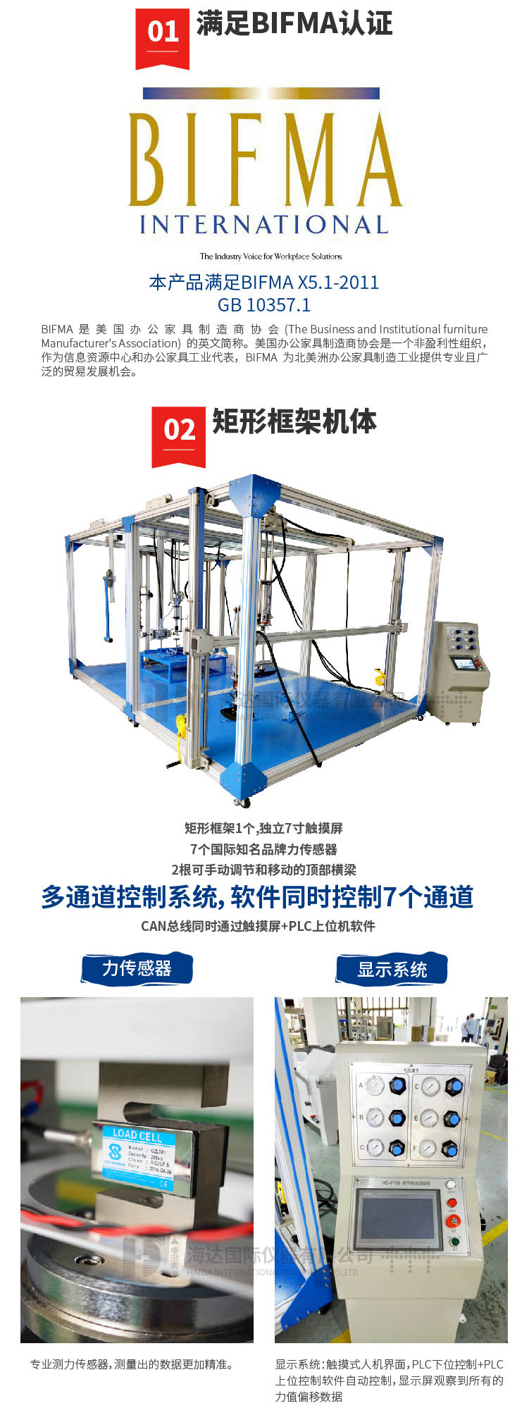 1、矩形框架1個,2根可手動調節和移動的頂部橫(héng)梁;7個國際知名品牌力傳感(gǎn)器 ;多通道控製係統,軟件同時控製7個通道,每個通道都通過(guò)基準同步時(shí)間進行操作,不同通道分組控製。