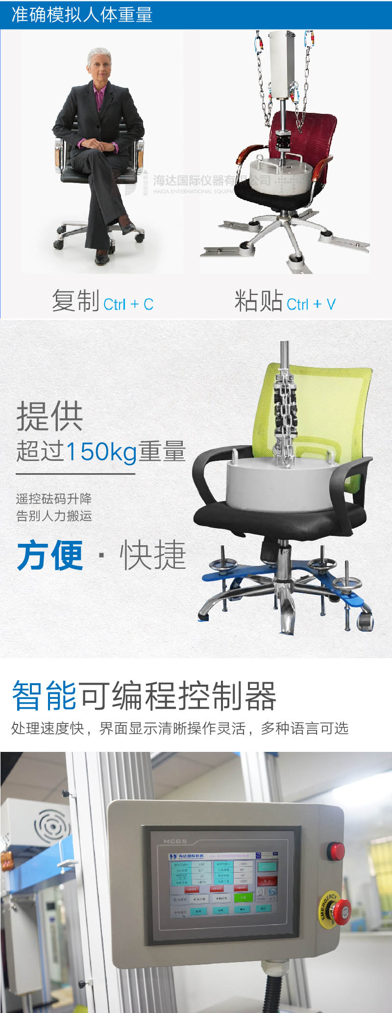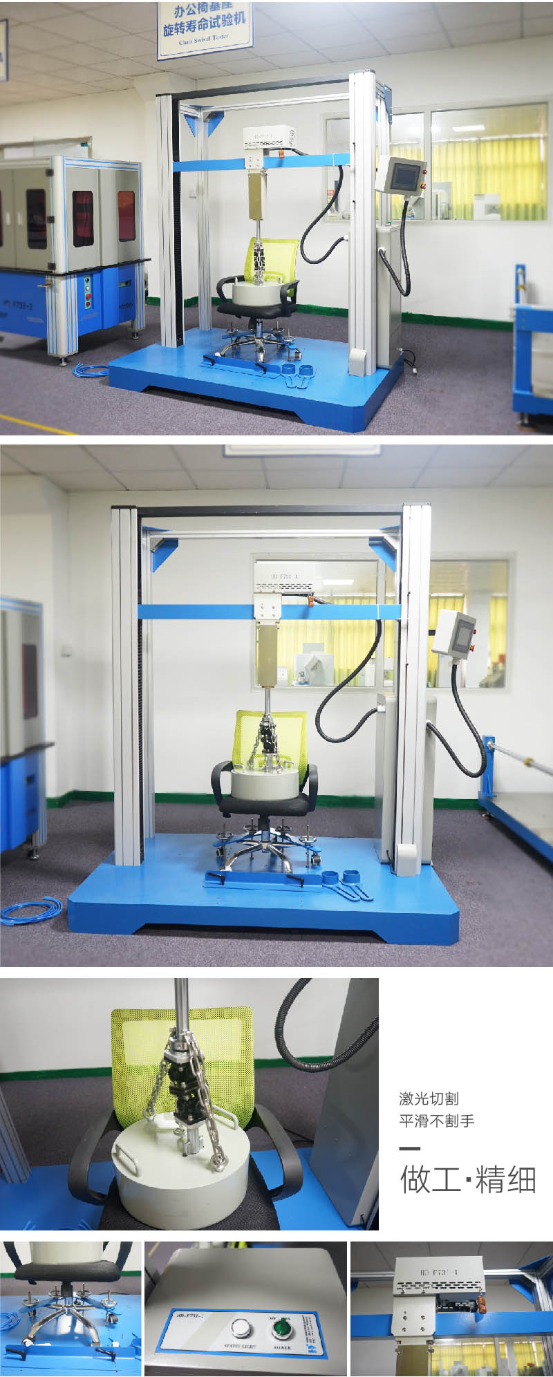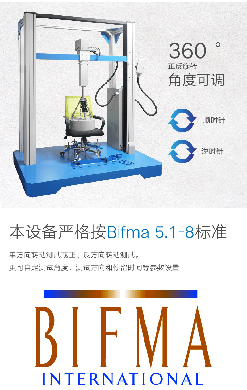 辦公椅旋轉壽(shòu)命試驗機適用於(yú)椅麵具有旋轉功能的辦公椅,用於評估(gū)辦(bàn)公椅子抵受重複旋轉的壓力及磨損 1、 可設(shè)定正轉和反轉角度(45°到355°) 2、 單向360°旋轉。 | ||