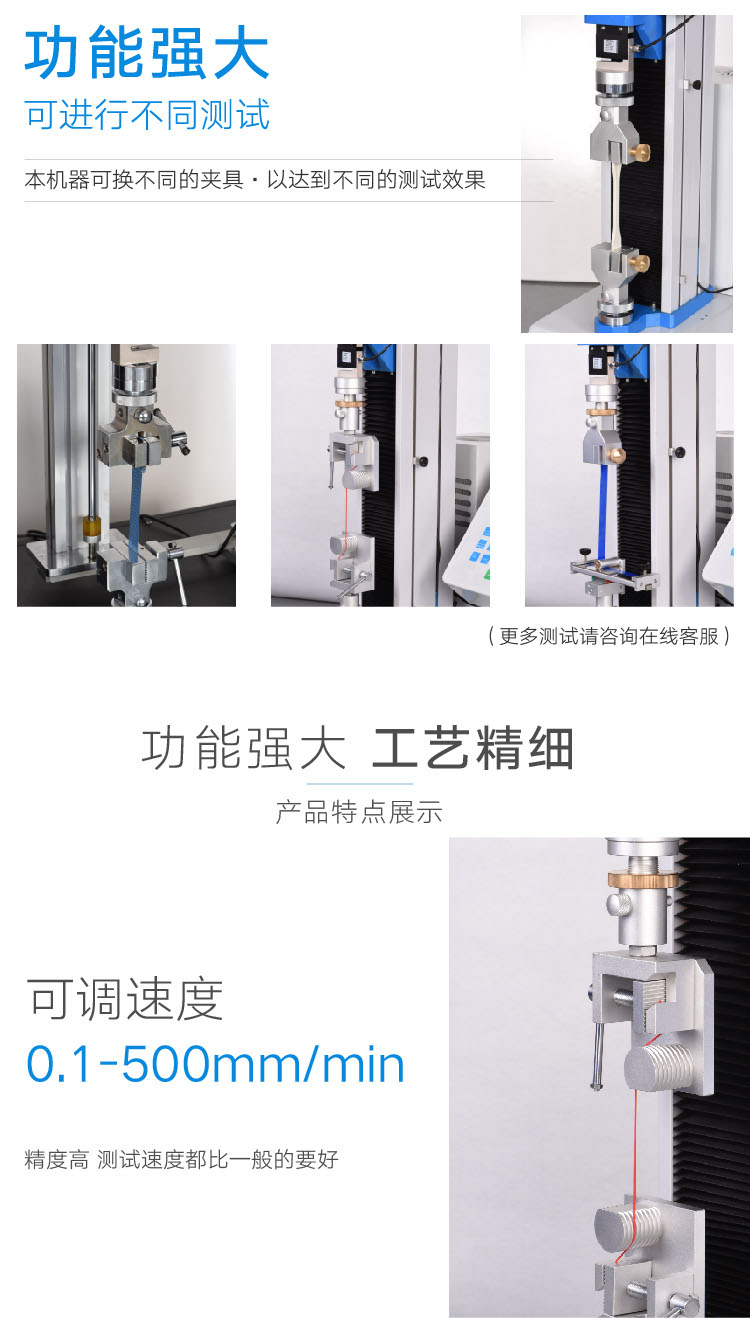 指標參數容量5kg,10kg,15kg,20kg,30kg,50kg,100kg,200kg,可選電機400w鬆下伺服電機驅(qū)動器(qì)400w鬆下伺(sì)服驅動器絲杆進口滾珠(zhū)絲杆控製方式麵板控製(zhì)(觸摸屏),可連電腦速度可調0.1-500mm/min最(zuì)大行程900mm(不含夾具)荷(hé)重(chóng)分解度1/250,000荷重精度≤0.5%單位切換gf/kgf/N//kN/LBf/T外形尺寸520*515*1250mm(L*W*H)淨重約70KG電源AC 220V整機功率500W 17.C-起草官网多功能拉力試驗機型號用途對比以下多功(gōng)能(néng)材料試(shì)驗機可進行:抗拉強度、抗壓強度及伸長量,可(kě)做剝離、撕裂、抗彎、抗(kàng)折、壓縮等試驗(yàn)。適用:膠帶、標簽、膠黏劑、保護膜、鍍層、金屬、電子、電線電纜(lǎn)、防水卷材、PCB材料、鋁(lǚ)合金、編織袋、塑料、橡膠、無紡布、安全帶等(děng)很多行業材料。型號款式特點容量1kg=9.8N測試功(gōng)能適用材料HD-B602單(dān)柱(zhù)電子式,經濟型200kg拉伸、壓縮、彎(wān)曲、撕裂、延伸率、剝離、剪切、粘接力、高粘剝離測試端子拉力、塑料件拉伸(shēn)、密封圈……HD-B609單柱電腦式 雙顯200kg薄膜、塑料、離型紙/膜、膠帶、紙張、複合帶、打包帶(dài)、鋁箔、保護膜、鋁塑板……HD-B609B-S單柱電腦伺服式200kg薄膜、離型紙/膜、膠帶、紙張、複合帶、打包帶、鋁箔、保護(hù)膜、鋁塑板、鏡片(抗壓)、吸波材料(抗壓)……HD-B617 單柱電腦式雙顯500kg線束、端子、橡膠、塑(sù)料(liào)……HD-B617-S單柱電腦伺服式500kg線束、端子、橡膠、塑料(liào)……HD-B603雙(shuāng)柱 門式電腦式2T拉斷、拉伸、抗壓、三點抗彎、四點抗彎曲測試 、撕(sī)裂、剪切等 電線(xiàn)電纜(lǎn)、木材、某些金屬、塑料、打包帶、背包、塑(sù)料桶(抗壓)、焊(hàn)接(jiē)點、安全帶(拉(lā)伸)、防水卷材(拉伸)……HD-B604-S雙柱門(mén)式電腦伺服式2T電線電纜、橡膠、鏈輪、PVC手套、木材、打包帶、某些金屬、焊接(jiē)點、木地(dì)板鎖扣 ……HD-B604B-S雙柱門式電腦伺服式2T電線電纜、橡膠、鏈輪、PVC手套、木材、打包帶(dài)、某些金屬、焊接點、木地板鎖扣、安全帶(拉伸)、防水卷材(拉(lā)伸)……HD-B615-S雙柱門式電腦伺服式5T金屬、鋼絲、鋼絲繩(shéng)……HD-B612-S雙柱門式電腦伺(sì)服式10T~30T拉伸、壓縮、彎曲、粘合、剪(jiǎn)切、環剛度、彈簧拉壓金屬板材、鋼絲(sī)、鋼(gāng)管、鋼板、鋼筋……HD-B616雙柱(zhù)門式(shì)油缸下置式30T/60T/ 100T抗拉、抗壓、屈服強度等金屬板材、鋼絲、鋼管(guǎn)、鋼板、鋼(gāng)筋……HD-B607-S雙柱門(mén)式高低溫環境 電腦伺服式(shì)3T高低溫、抗拉、抗壓等塑料、橡膠……夾(jiá)具提示:200多款(kuǎn)不同夾具,具體需依據客戶具體測試(shì)樣品選型。備注:以上參數僅供參考,為對客戶負責(zé),具(jù)體材料選型請以銷售(shòu)溝(gōu)通後為準。 產品特點 (一)結(jié)構特點 1.機殼采用A3鋼板,使用精密激光切割及(jí)數控折床彎折、焊接成型,附著光澤白與金屬藍配色的烤漆塗(tú)裝; 2.采用(yòng)雙顯雙控的操作係統,可連接電腦通過軟件進行試驗,也可通過觸摸屏設置參數進行試驗; 3.柔(róu)性風琴式一字防護罩,質感輕柔,有效(xiào)防止因材質過硬(yìng),摩擦產生振動所帶來的(de)過大異響; 4.設備(bèi)采(cǎi)用行星減速機,具有效率高(gāo)、運轉平穩、噪聲低、適應性強等特點。 (二)測試係統 1.多通道測力係統,可同時校準(zhǔn)四個傳(chuán)感器,適用(yòng)多種量程傳感器選配; 2.配置鬆下伺服電機係統(tǒng),搭配精密滾珠絲杆多軸定(dìng)位技(jì)術(shù),位移精度0.5級,傳動(dòng)係統效率高(gāo)、傳動平穩; 3.控製(zhì)器采用我司(sī)自(zì)主研發力值(zhí)測試軟件,可完成參數設定、運行狀態(tài)控製、數據收集、分析處理及監控、結果(guǒ)報(bào)表輸出; 4.軟件有英語、中文簡體與繁體三種語言形式可選,使用(yòng)方便; 5.限位保護、過載保護、自動(dòng)回位等智能設計,保證操作安全(quán)。 | ||
