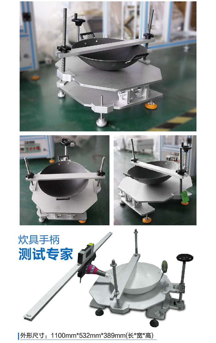 把試樣固定在測試平台上,調節緊固裝置的角度,使連接炊具手柄的(de)平(píng)衡(héng)杆達到水平,同時指針指向分度表的零位。把測試(shì)砝碼分別懸掛於平衡杆的一端並保持靜止30s,角度尺記錄平衡杆(gǎn)偏轉的角度,檢查手柄和連接部件,記錄(lù)試樣的損壞(huài)情況。