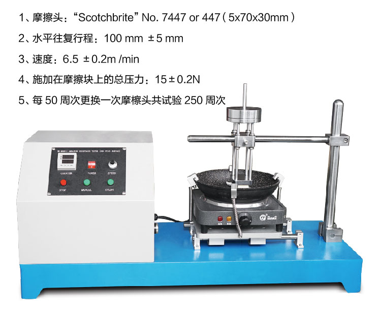 1、 摩(mó)擦頭(tóu):“Scotchbrite” No. 7447 or 447 (5x 70 x30mm) 2、 水平往複行程:100 mm ±5 mm 3、 速度:6.5 ±0.2m /min 4、 施加在摩擦塊上的總壓力:15±0.2N 5、 沒50周次更換一次(cì)摩檫(chá)頭共試驗250周次 | ||