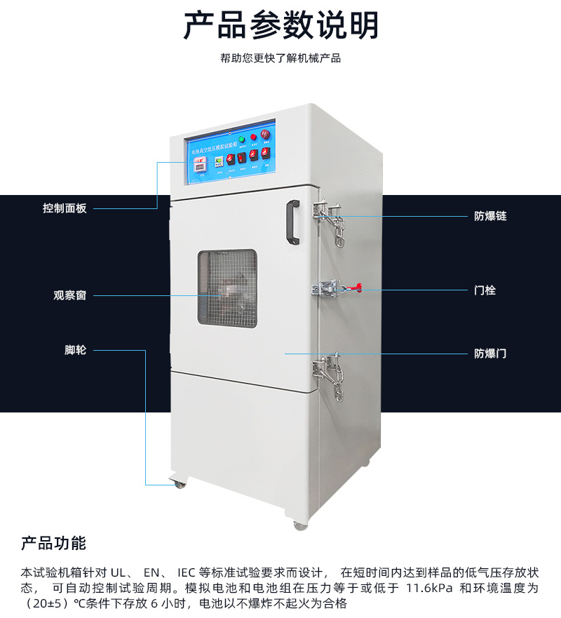 本試(shì)驗機箱針對UL、EN、IEC等標準試(shì)驗要求而設計,在短時間內達到(dào)樣品的低氣(qì)壓存放狀態,可自動控製試驗周期,全程監控箱內氣壓(yā)變化,實現試驗的自(zì)動終(zhōng)止。模(mó)擬電池和電池組在壓力等於或低於11.6kPa和環境溫度為(20±5)℃條(tiáo)件下(xià)存放6小(xiǎo)時(shí),如果電池無滲漏(lòu),無排氣,無解體,無(wú)破裂和(hé)無起火,並且每個實驗電池或電池組在試驗後的開路電壓不(bú)小於其在進行模擬實驗前的電壓的90%,即為合(hé)格。 滿足標準:GB/T 31485-2015,GB/T 31241-2014,UN38.3,IEC62133,QC/T743-201X,GB/T 8897.4-2008,GB/T 21966-2008 | ||