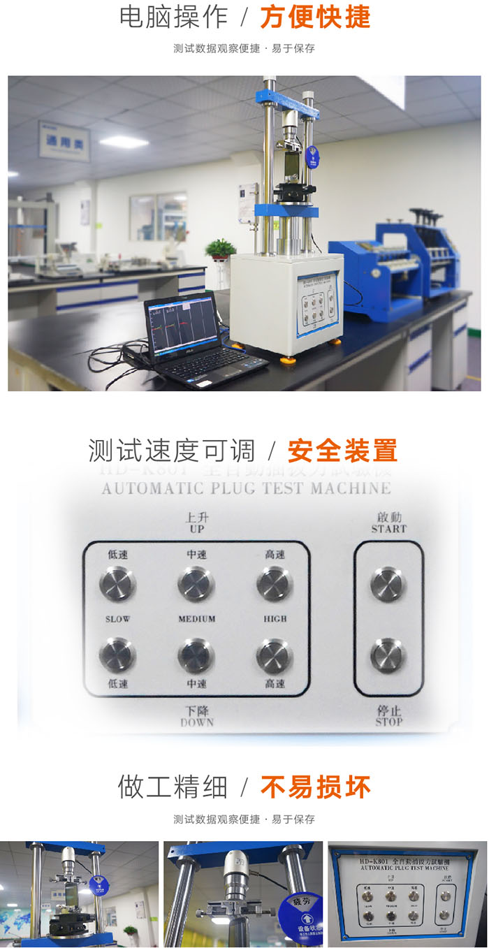 插(chā)拔力試(shì)驗機適用於各種手機及電腦周邊連接器的插拔力試驗,本機能解(jiě)決各種(zhǒng)連接器測試的夾具問題,及測試時(shí)公母連接器能自動對準,不會有吃單邊的問題。 特點 1.可連續做插入力(lì)及拔出力值之變化情(qíng)形;可作連接器插拔壽命(mìng)試驗(yàn)。 2.采用伺服係統脈衝(chōng)控製,控製精度為0.001mm, 3.通過電腦可作(zuò)一(yī)係列(liè)的過程控製:插拔行程、速度、次數、暫停時間、插拔力(lì)顯示以及繪製位移和插(chā)拔曲線圖,報表打印、數據儲(chǔ)存。 4.測試條件皆由計算(suàn)機畫麵設(shè)定。 | ||