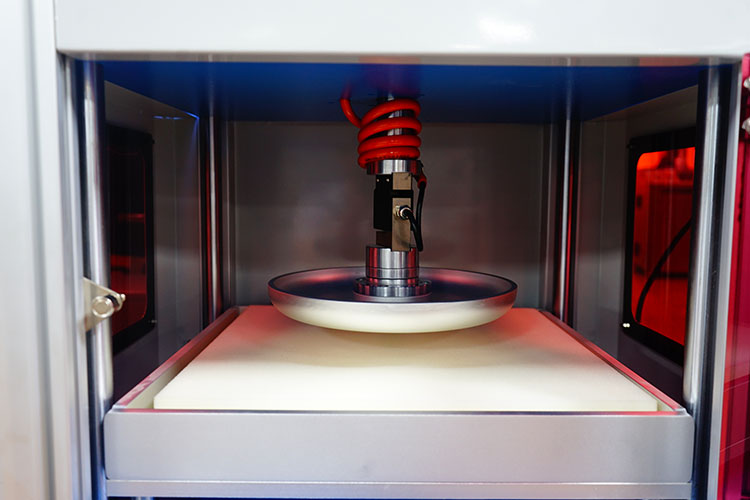 本機用於測定多孔彈性材料的凹入硬度(dù)。可(kě)對(duì)聚氨脂海綿泡沫試樣(yàng)按照標準的規定進行測試,準確測出海綿、泡沫等材料的壓陷硬度,另(lìng)也可用於對已(yǐ)生產出的座椅(yǐ)泡(pào)沫(如靠背、座墊泡沫等)進行規定壓陷硬度的測量,準確(què)測出座椅各泡沫(mò)件的壓(yā)陷(xiàn)硬度。此外,本產品還(hái)可以針對泡沫聚合材料進行往複壓縮試驗,測定試樣的厚度減小值和殘餘變(biàn)形率(lǜ),由此(cǐ)了解材料的動(dòng)態疲勞(láo)特性。 疲(pí)勞(láo)測試:將一個方(fāng)形試樣放入到測試(shì)儀的(de)下平台上,用一個麵積比試樣(yàng)小一些(xiē)的壓盤反複地凹入試樣,使每一次循環所(suǒ)達到的最(zuì)大負載值保持在規定範(fàn)圍內,通過(guò)一定次數後,評定試樣的性(xìng)能。 壓(yā)陷硬度測試:將方形試樣(yàng)放入到測試儀的下(xià)平台(tái)上,上壓盤以規定速(sù)度向下壓縮一定的尺寸,按標準要(yào)求的A法(B法、C法)進行測試,荷(hé)重元將感應到的壓(yā)力反饋給電腦處理,通過電腦測試界麵查(chá)看數據(jù)結(jié)果(guǒ),從而測得海綿、泡沫等試樣等材料的壓陷硬度。 設計(jì)標準:GB/T 12825-2003、GB/T 18941-2003、ISO2439-2008、ISO3385-2014、ASTM_D3574、GB/T_10807-2006 | ||