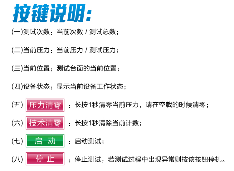 1、型號:HD-F750-2 2、中英文操作係(xì)統:PLC 觸(chù)摸屏控製器 3、下壓盤:孔的(de)直徑6mm, 間距20mm 4、壓頭:直徑250 mm± 1 mm 5、下邊緣半徑:25 mm± 1 mm 6、壓力:750 N ± 20 N 7、測試速度:(70 ± 5) 次/ 分鍾(可調(diào)) 8、樣品尺寸:平行六麵體(tǐ),長和寬(kuān)度:380 mm± 20 mm,厚度:50 mm± 2 mm 9、計數器:六(liù)位計數器,記錄測試次數 10、容量:100kg | ||