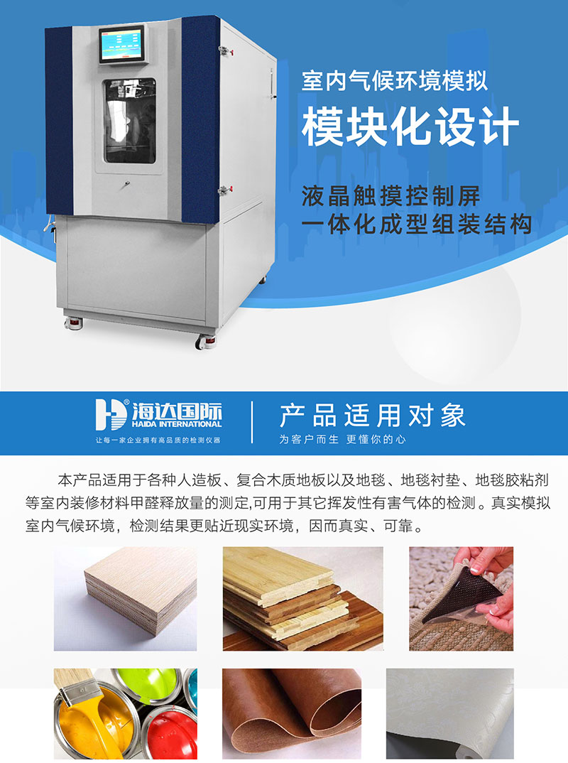 甲醛試驗箱(1個立方)適用於各種人造板、複(fù)合木質地板以及地毯、地毯襯墊及(jí)地毯膠粘劑等室內裝修(xiū)材料甲醛釋放量的(de)測定、木材或人(rén)造板的恒溫、恒(héng)濕平衡處理,也可用於其它建材中揮發性有(yǒu)害氣體的檢測。該產品特點在於可大限度的模擬室內氣候(hòu)環境,檢測結果更貼近現實環境,因而真實、可(kě)靠。 工作原理: 將1平方米表麵積的樣品放人溫度、相對濕度、空氣流速和空氣置換率控製在(zài)一定值的氣候箱內。甲醛從樣(yàng)品中釋放出來,與箱內(nèi)空氣混合,定期抽(chōu)取箱內空氣,將抽出的空氣通過盛有蒸餾水的吸收瓶 ,空氣中的甲醛全部(bù)溶入水中;測定吸收液中的甲醛量及抽取的空氣體積,用毫克每立方米(mg/m³)表示,計算出每立方米空氣中的甲醛(quán)量。取樣是周期性的,直到測試箱內甲醛濃度達到平衡狀態。 設計標準: 1、GB18580—2017 《室內裝飾裝修材料 人造板及其製品中甲醛(quán)釋放(fàng)限量》 2、GB18584 《室內裝(zhuāng)飾裝修材料木家具中有害物質限量》(審批稿) 3、GB18587—2001 《室內裝飾裝修材料地毯、地(dì)毯襯墊及地毯膠粘劑有(yǒu)害物質釋放限量》 4、GB17657—2013 《人造板及飾麵人造板理化性能(néng)實驗方法》 5、GB50325—2010(2013 年板(bǎn))《民用(yòng)建築工程室內環境汙染控製規範》 6、ASTM D6007—02《小尺度環境(jìng)箱測定木製品釋放氣體中(zhōng)甲醛濃度的標準測(cè)試方法》 7、LY/T 1612-2004《甲醛釋放量檢測用1m3氣候箱》 8、SZJG 52-2016《家具成品及原輔材料中有害物質限(xiàn)量》 9、GB/T 2912.1-2009 《紡織品 甲醛的測定 第1部分:遊離和水(shuǐ)解》 10、GB/T 2912.2-2009 《紡織品 甲醛的測定 第(dì)2部分:釋放(fàng)的甲醛(蒸汽吸收法(fǎ))》 11、GB/T 2912.3-2009 《紡織品 甲醛的測定 第(dì)3部分:液相(xiàng)色(sè)譜法(fǎ)》 | ||