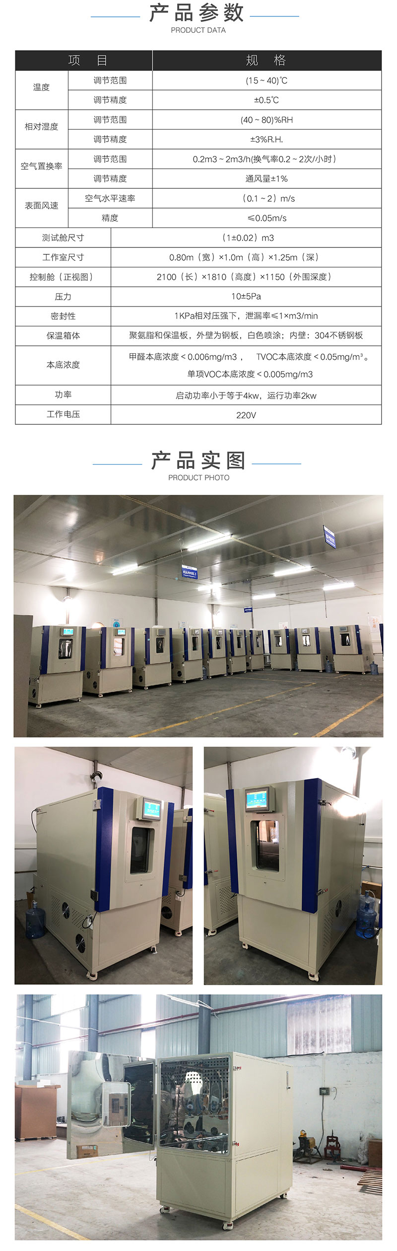 1.箱內容積:(1.0±0.02)m³; 2.測試(shì)艙箱內(nèi)溫度可調範(fàn)圍:(10—40)℃,精度:±0.5℃,分辨(biàn)率0.1℃,連續可調; 3.箱內相對濕度可調範圍:(30—80)%,精度(dù):±3%,分辨率0.1%,連續可調; 4.箱內空氣流(liú)速:(0.1—2)m/s,精度:±0.05 m/s,連續可調; 5.空氣置換率:(0.2—2)m³/h,精度:±5%,連續可調; 6.密封性:當有1000Pa的過壓時,氣體泄漏(lòu)少於10-3×1m³/min,進出口氣體流量差小於1%; 7.測(cè)試(shì)艙內本(běn)底濃度:甲醛≤0.006mg/m³; 8.絕熱性(xìng):氣候箱壁及門(mén)應具(jù)有有效的熱絕緣; 9.噪音:氣候箱(xiāng)工(gōng)作時的噪(zào)聲值不大於60dB; 10.連續工作時(shí)間:氣候箱連續工作(zuò)時間不小於40 天(tiān); 11.監測(cè)參數:監測顯示(shì)艙內的溫濕(shī)度、送排風量、開關機時間、工作時間,數(shù)據可轉移存儲; 12.控濕方法:采用露點控濕法,來控製工作艙相對濕度,濕度穩定,波動幅度<3%.rh.並且不(bú)會在艙壁產生水珠; 13.外形尺寸:1630 x 1200 x 1806mm (長x寬x高); 配置清單(dān) 1.標配:主機一台,抽樣管、吸收瓶、氣體采樣器; 2.選配:分光光度計,水浴鍋,藥劑,玻璃儀器,標準溶液,天平; | ||