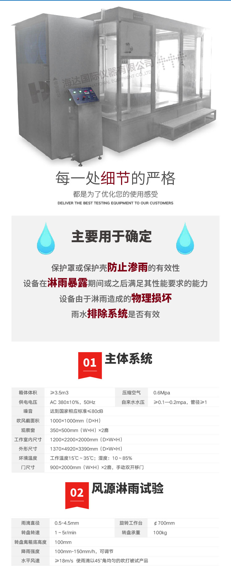 滴水試(shì)驗房適用於考核電工產品,外殼和密封在淋雨環境下能否(fǒu)保證設備和元件良(liáng)好性能的試驗。本產品采用科學設計,使得該設備(bèi)能夠逼真的模擬滴水環境。 設計標準:IP GJB150.8A-2009 標準之程序III | ||