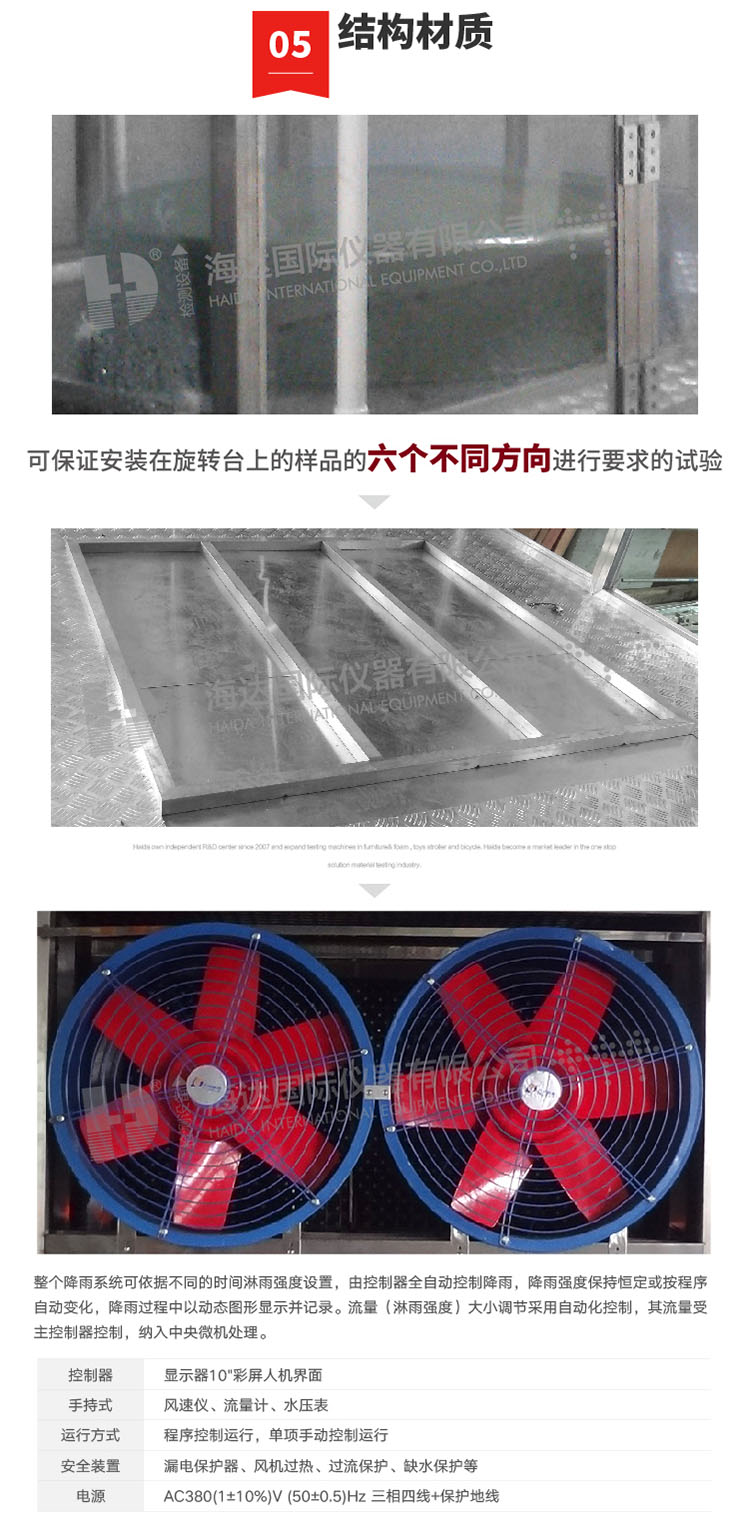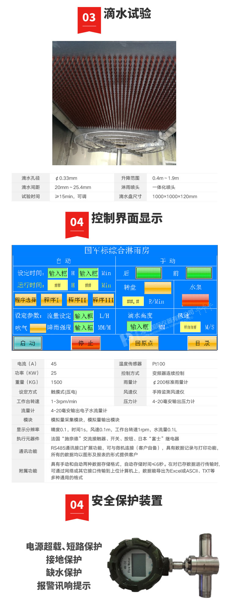 1、內箱尺寸(mm):2500×1500×2800(深×寬×高) 外型尺寸(mm)3800X 1600X3500(深×寬×高) 2、試驗台轉速(sù)(rpm):1 ~3可調 3、滴水箱(mm): (1)1000X1000MM 孔距20X20Mm,孔徑:0.6Mm 4.、滴水箱與被(bèi)測樣品的距離:1000MM 5、滴水孔直徑(mm):φ0 .4 (水滴直徑0.5-4.5MM) 6、噴水孔徑間距(mm):20 MM 7、試驗(yàn)時間:1-999,999min(可設定) 10、樣品溫度:高於常溫水10° 11、箱體采用方通做骨架(jià),彩鋼板作為封板。 12、配有適中的樣品架(放樣品用(yòng))轉速可調,正方型:1000X1000MM 13、滴水試驗機降水(shuǐ)量:1.7mm/min 14、控製係統:公司自(zì)主研發(fā)的Teelong控製係統。 滴水試驗房(fáng)滴水(shuǐ)要求 ① 雨滴直徑範圍:0.5~4.5mm ; ② 雨滴均勻降落,使試驗台麵上樣品所有向上的表麵在試驗期間能同時經受到雨滴; ③ 具(jù)備(bèi)從高1m處勻速降落的雨水且試(shì)驗(yàn)持續時間大於15min的試驗能力; ④ 噴嘴為方格噴霧點陣(zhèn)或其它交錯的(de)點陣(zhèn); ⑤ 滴水箱采用真空(kōng)設計,配(pèi)以氧化合金鋁及高防鏽不鏽鋼材(cái)質構造(zào),噴(pēn)咀接觸位不鏽鋼錐形設計,方便及時安裝及更換(huàn)針咀; ⑥ 直流電動升降馬達驅(qū)動,不鏽鋼絲杆、滑輪導軌輔以鎖緊螺母升降裝(zhuāng)置; ⑦ 鋁合金和不鏽鋼機身; ⑧ 水箱邊(biān)框:工業合(hé)金鋁(表麵氧化); ⑨ 水箱板(bǎn):水箱(xiāng)采用USU304#不鏽(xiù) (其中下封板有安裝針座的螺紋孔); ⑩ 水箱升降導軌(guǐ):成型導軌、膠質滑輪導輪; ⑪ 滴水孔徑:¢0.6mm和0.33Mm; ⑫ 孔 距:20mm; ⑬ 降雨量:1.7mm/min,用戶自(zì)設定(dìng)參(cān)數( 誤差:+0.2mm/min); ⑭ 試驗時間:0-999min (可設定及中間控製)。 結構材質 1. 可保證安裝在旋轉台上的(de)樣品的四個不同方向進行 要求(qiú)的(de)試驗; 2. 承(chéng)載≥100Kg、安裝(zhuāng)樣品的麵(miàn)積≥φ1200; 3. 轉速範圍:1~5rpm/min連續可調,可設定自動工作(zuò); 4. 試件尺寸空間:600mm×600mm×1800mm; 5. 淋雨板尺寸:W1000×D1000×H120mm; 6. 滴雨試驗室內部尺(chǐ)寸:W2500×D1500×H2800mm; 7. 外部(bù)尺寸:W3800×D1600×H2700mm; 8. 材料:靜電噴塑薄板外殼 9. 內體:304#; 10. 滴(dī)水盤:304#; 11. 旋(xuán)轉台麵:304#; 12. 支架型(xíng)材:304#; 13. 工作室門:平拉門,帶鋼化玻璃觀察窗; 14. 風機葉輪:鋁合金噴塑材料(liào); 15. 風機:軸流風機; 16. 控製器:顯示器 7"彩屏人(rén)機(jī)界麵; 17. 運行方式:程序控製運行;單項手動控製運行; 18. 設定方(fāng)式:觸摸式(壓電); 19. 設定精度:時間:1秒,風速1米(mǐ)/秒; 20. 工作台轉速:1rpm/min; 21. 控製方式:PLC、步進電機等控製; 22. 電源:AC380(1±10%)V (50±0.5)Hz 三相四線+保護地線; 23. 電源電流(A) 45 、功率(KW) 25 、重量(kg) 1500; 24. 保護(hù)裝置:漏電保護器、風機過熱、過(guò)流保護、缺(quē)水保護等。 保護裝置 1、電源超載、短路保護 2、接地保護 3、缺(quē)水保護 4、報警訊響提示 | ||