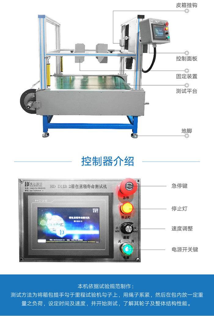 1、皮箱行走顛簸(bò)磨耗試(shì)驗機又名箱包裏程壽命試(shì)驗機,箱包跑(pǎo)步試驗機。 2、用(yòng)於(yú)附有輪子(zǐ)的箱包、童車…的行走試(shì)驗,測試其在行走使用時皮箱輪之使(shǐ)用品質,通(tōng)過測試裏程、測試速度,以(yǐ)檢視皮箱輪之耐熱、破裂及損耗量,檢(jiǎn)測輪子(zǐ)材料的耐磨性及箱子的整體結構有無(wú)破壞情(qíng)形及變形,試驗的結果,可供作改進的參考。 設計標準:QB/T 2920-2010 |