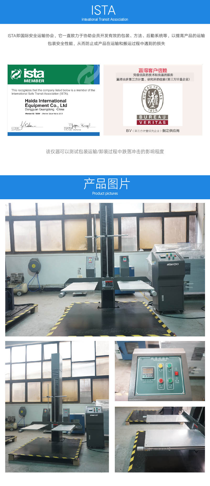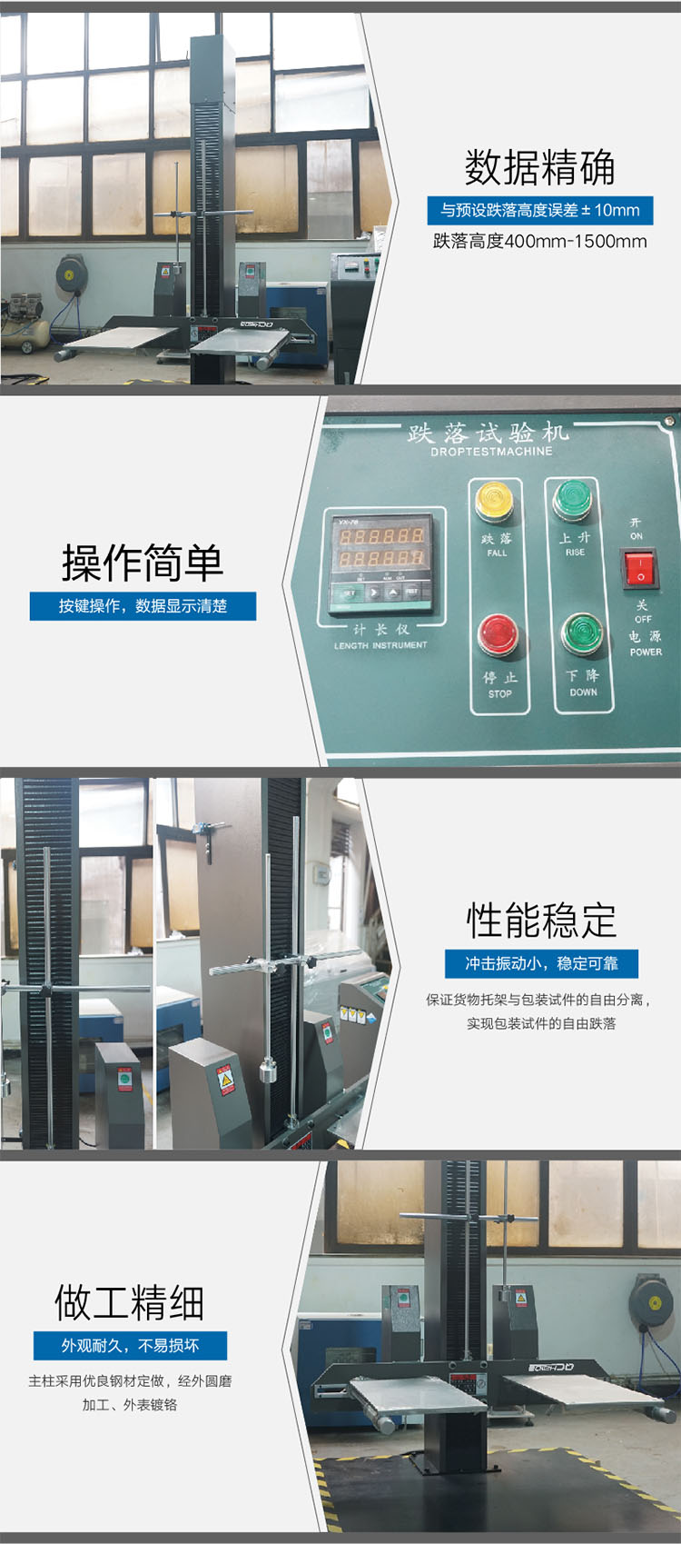 跌落試驗機(jī)用於測試產品包裝受到墜落之受損情況,及評估運輸搬運過程(chéng)時耐衝擊(jī)強度(dù)。采用雙柱導向、 高度跌落次數可置,工作穩定可(kě)靠,可實現棱(léng)、麵、角跌落(luò),滿足GB/T4857.5-92、ISO2248-1972E。采用光 電控製,可設定七檔跌落高度,也可自由選擇跌落高度,跌落釋放采用電磁控製(zhì),能使試樣瞬間自由(yóu)落下, 對(duì)包裝容器進(jìn)行(háng)之棱、角、平麵進行跌落(luò)衝擊試驗。