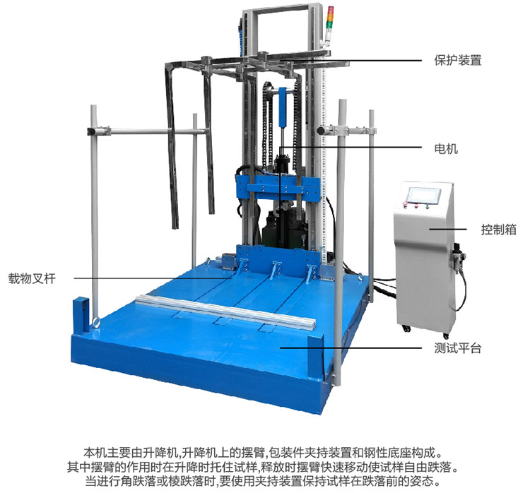 1、試件滿載重量:500KG、1000KG; 2、測試空間(jiān):1200*1400*2200mm(可定製); 3、測(cè)試高度:0-1000mm任意設定可調; 4、測試方式:棱、角、麵; 5、驅動方式:電機、氣缸驅動; 6、保護(hù)裝置:上、下設有(yǒu)感應型保護裝置; 7、衝擊板材(cái)質:45#鋼材,實心鋼(gāng)板; 8、高度顯示:觸摸屏操作; 9、傳動方式:氣動加速裝置+台(tái)灣(wān)進口直線(xiàn)滑塊+銅質導套+45#烙鋼 10、托臂結構:45#鋼材,方通焊接而成; 11、跌落高度:采用高精度編碼器控製; 12、外形尺寸(L*W*H):2130*1300*2470mm; 13、控製箱尺寸(L×W×H):350×350×1100mm; 14、電源:220V/50HZ; | ||
